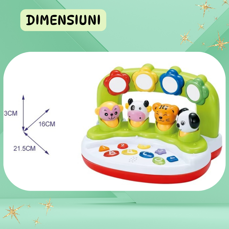 📚 O jucarie interactiva si educationala, perfecta pentru dezvoltarea timpurie a copiilor! Aceasta jucarie inteligenta imbina distractia cu invatarea, ajutand copilul sa recunoasca sunetele animalelor, denumirile lor in limba engleza, cifre, litere, forme si culori.