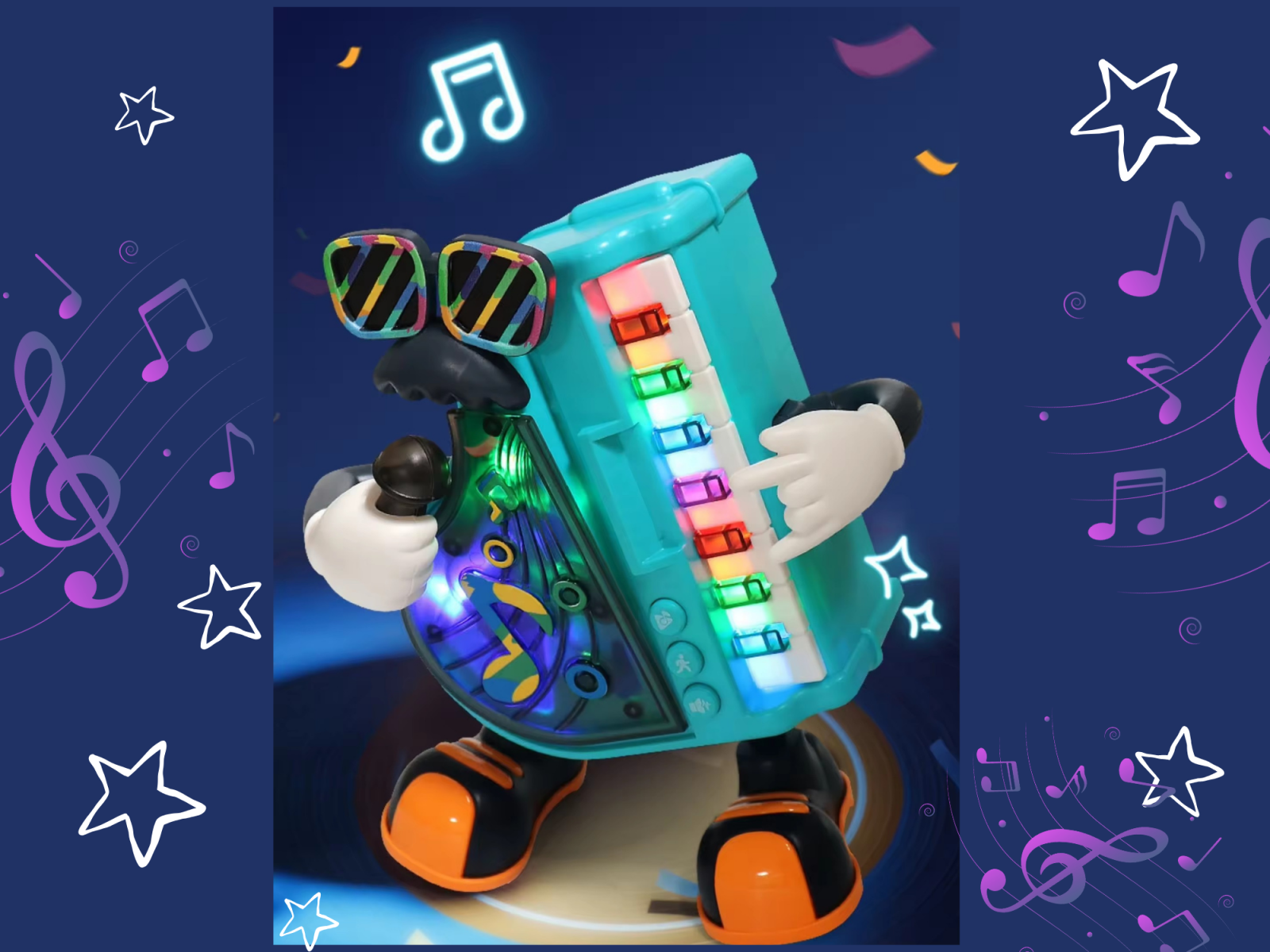 - Joaca interactiva: Miscarile de dans stanga-dreapta si luminile sincronizate transforma joaca intr-o activitate activa si distractiva.