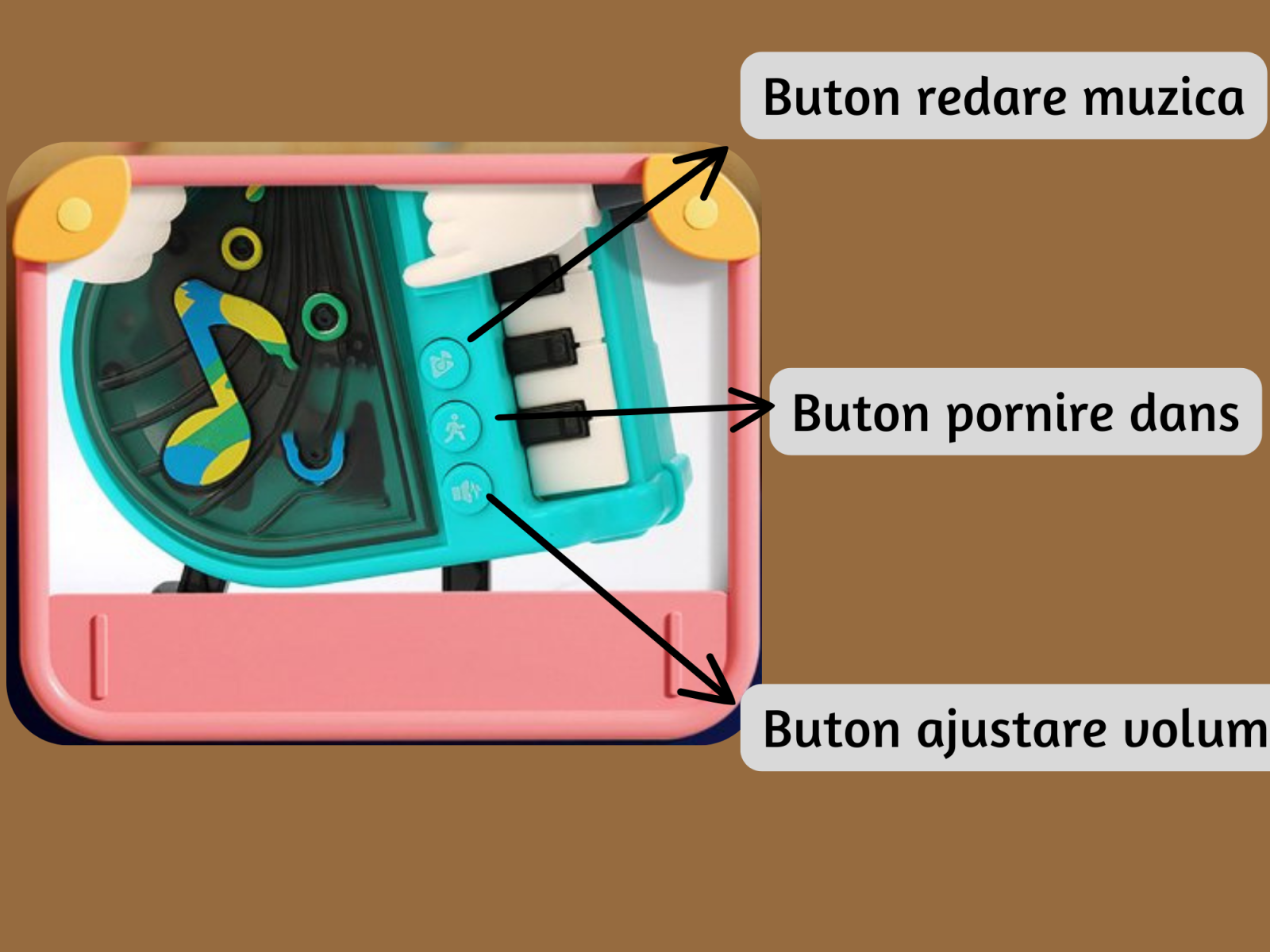- Control personalizat: Butoanele dedicate pentru volum, dans, si muzica permit ajustarea functiilor in functie de preferintele copilului.