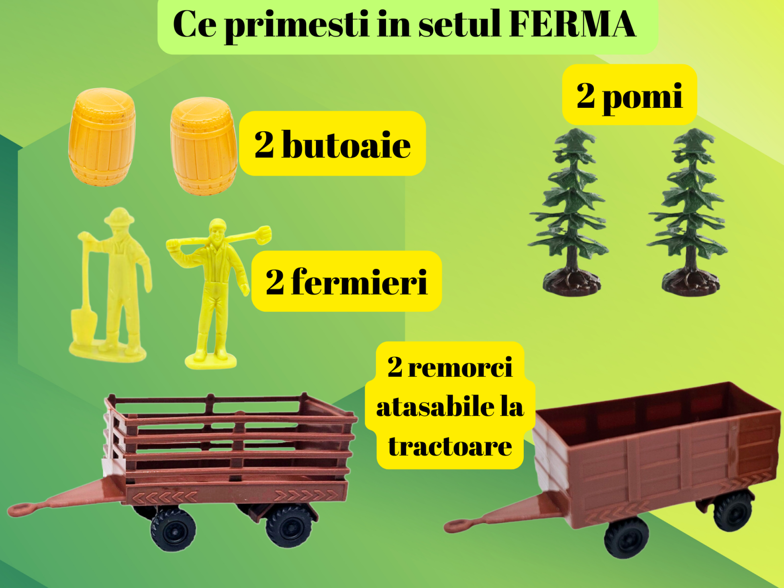 - 4 tractoare agricole: Fiecare tractor este echipat cu utilaje agricole diferite in partea din fata, ideale pentru diverse activitati pe camp (arat, semanat sau transport).