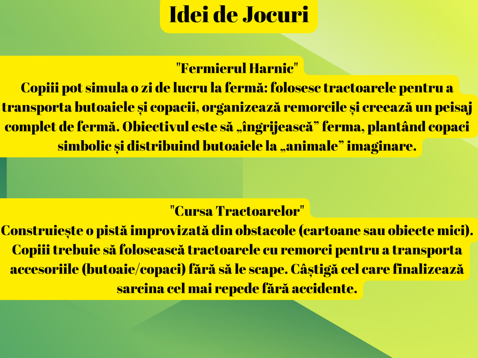- Cursa tractoarelor: Organizeaza o cursa amuzanta cu tractoarele pentru a vedea care ajunge primul la destinatie cu remorcile incarcate.