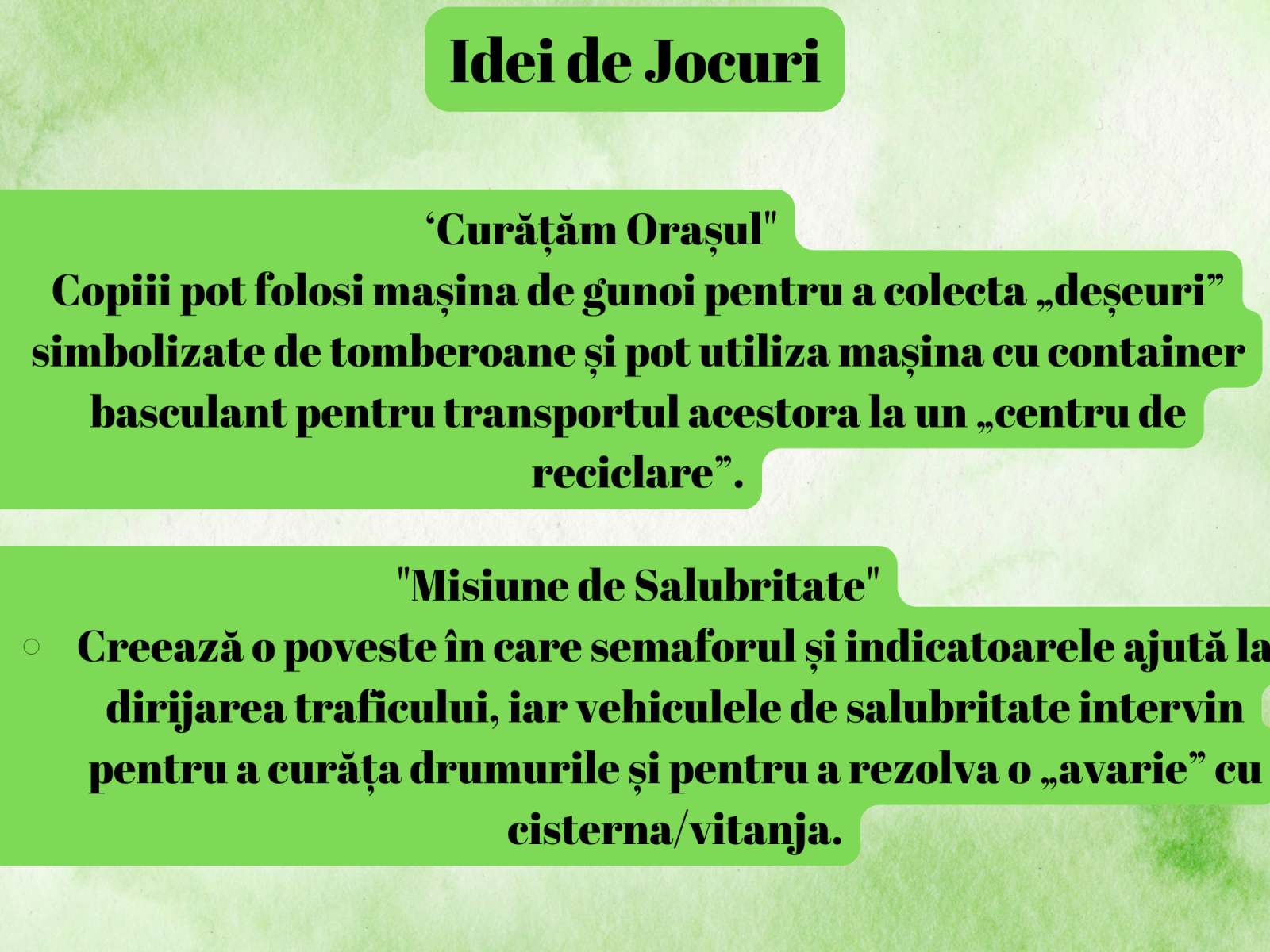- Curatenie in oras: Creeaza un oras imaginar in care copilul trebuie sa colecteze gunoiul folosind camionul si masina de gunoi, transportandu-l la statia de reciclare.