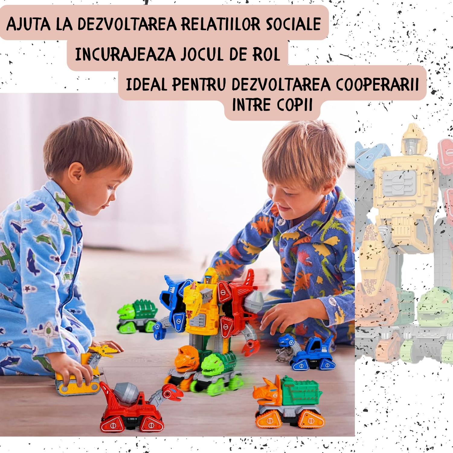Set 5 in 1, Dinozauri Transformabili in Robot, – Jucarie Educativa 2 in 1 cu Functie Pull-Back, Metal si Plastic, 6 Cartonase, +3ani, ERGINO®
