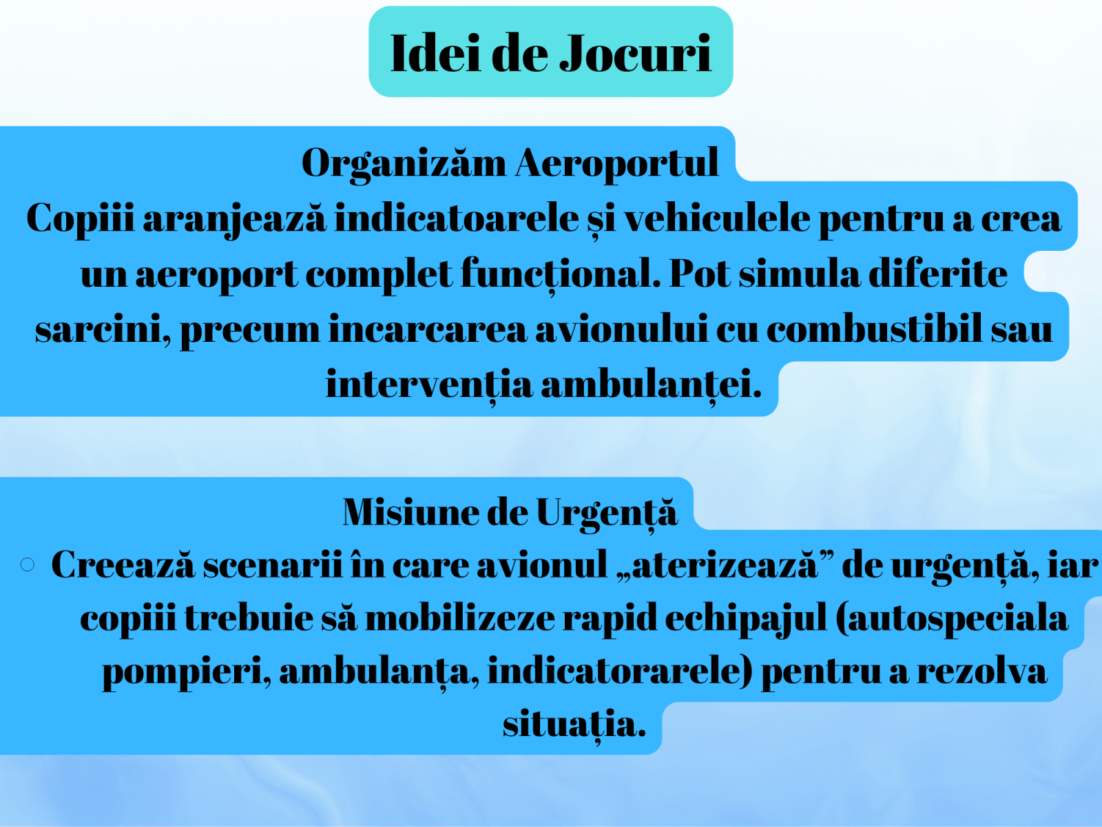 - Organizarea unui aeroport: Copiii pot crea propriul aeroport, plasand indicatoarele si coordonand activitatile vehiculelor, cum ar fi alimentarea avionului sau interventiile de salvare.