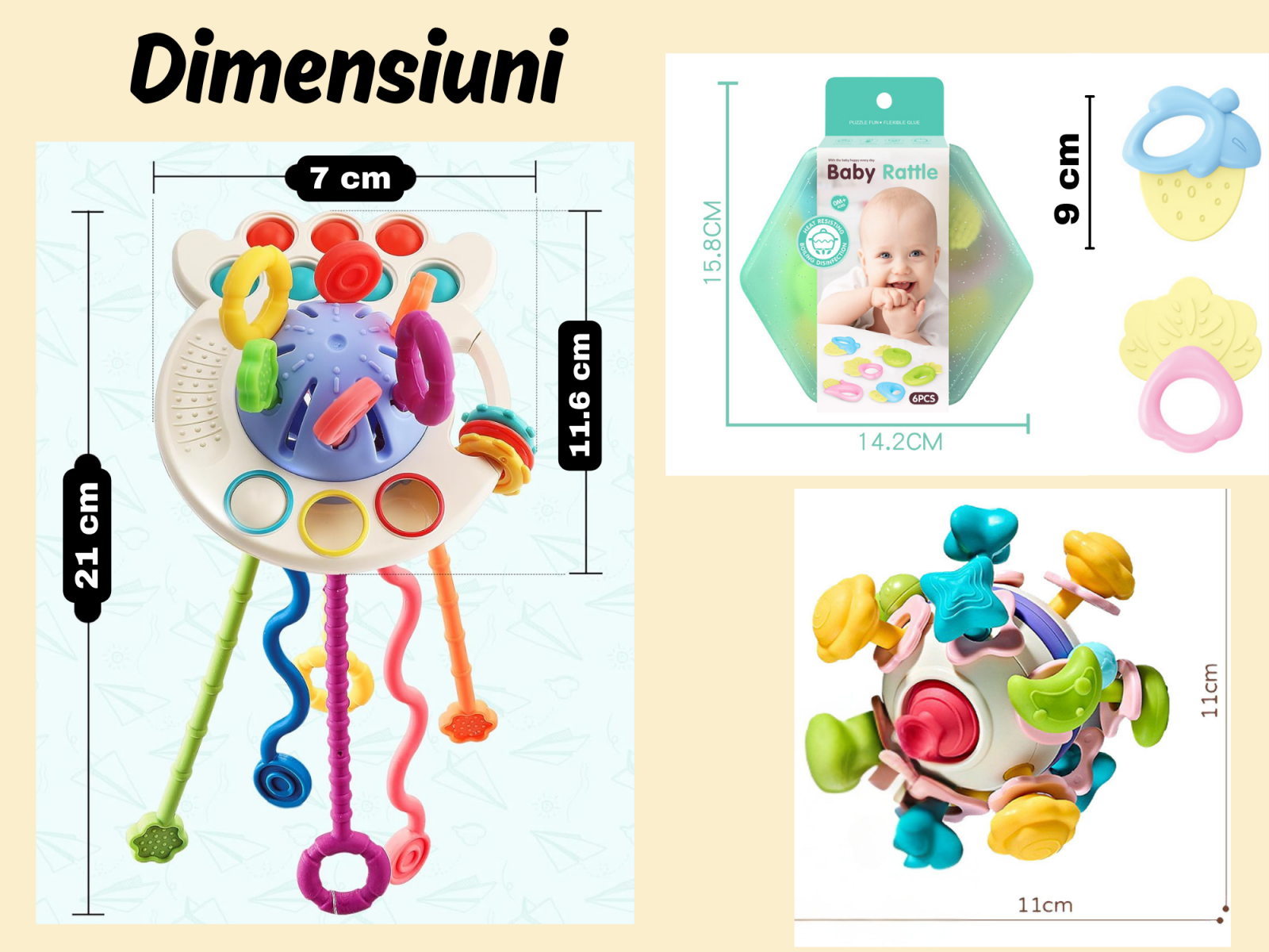 Acest set versatil de jucarii pentru dentitie si dezvoltare este format dintr-o jucarie tip caracatita, o minge interactiva si un set de 8 jucarii de dentitie in cutie, toate concepute pentru a oferi micutului tau o experienta placuta, educativa si linistitoare. Perfecte pentru a fi luate oriunde, datorita dimensiunilor compacte. Fiecare element este proiectat pentru a oferi stimulare senzoriala, alinare in timpul eruptiei dentare si dezvoltarea abilitatilor motorii ale micutului tau.