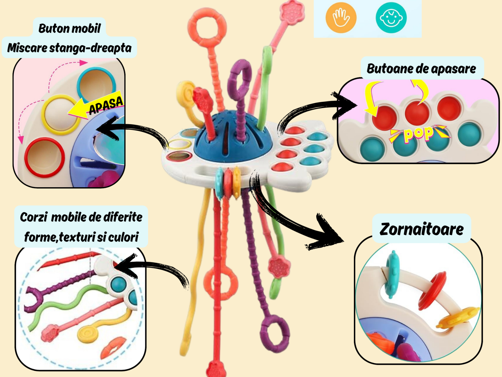 Jucaria tip caracatita: Cu tentacule flexibile, texturate si activitati captivante precum butoane glisante, inele de prins si sunete atragatoare, aceasta jucarie stimuleaza coordonarea mana-ochi si dezvoltarea senzoriala. Este usor de prins si de utilizat de mainile mici ale bebelusului si ofera o modalitate sigura si placuta de a calma disconfortul dentar.