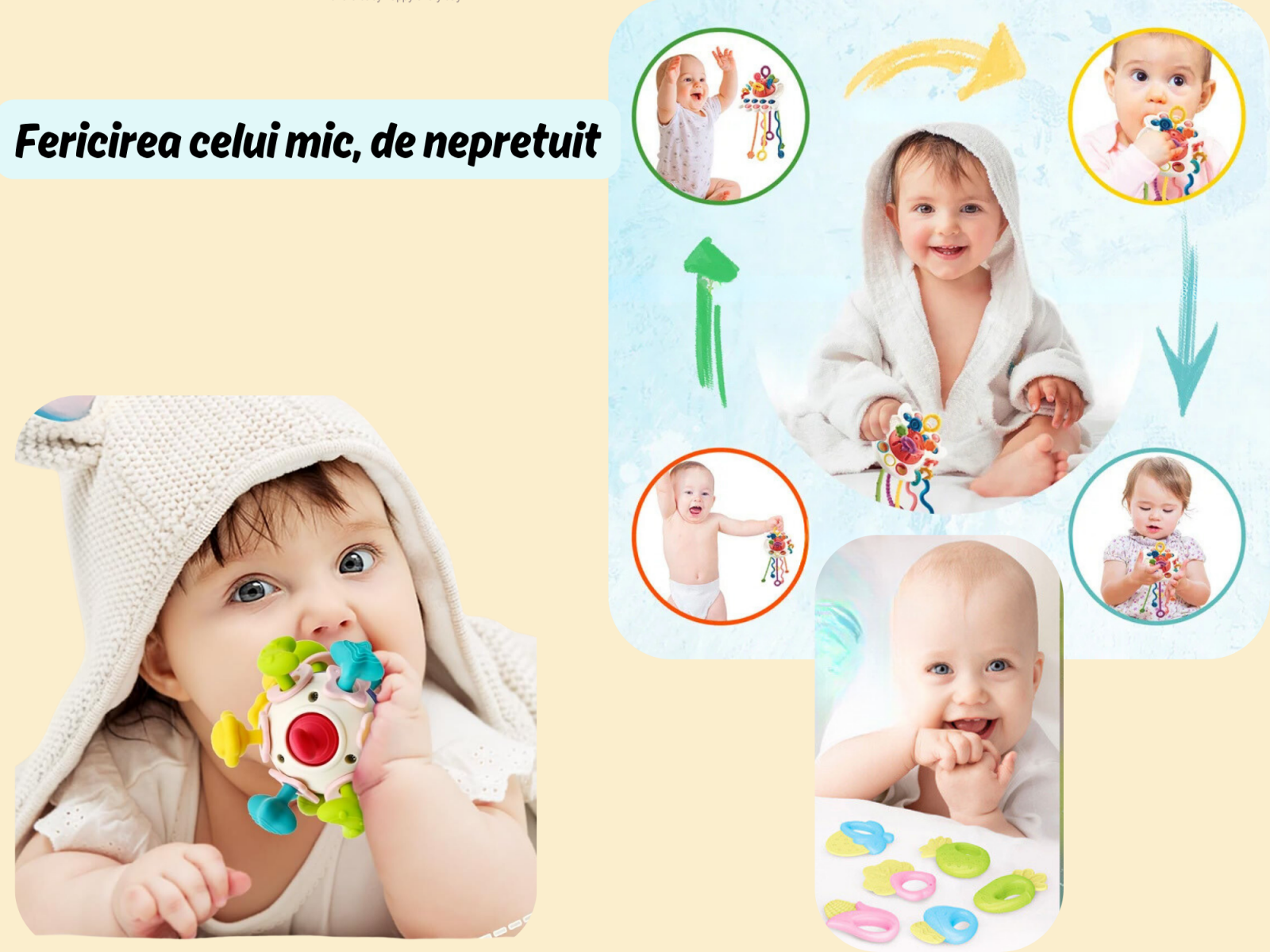 Calmarea durerilor de dinti: Fiecare jucarie este proiectata special pentru a calma disconfortul cauzat de cresterea dintilor, oferind o suprafata sigura si confortabila pentru ros.