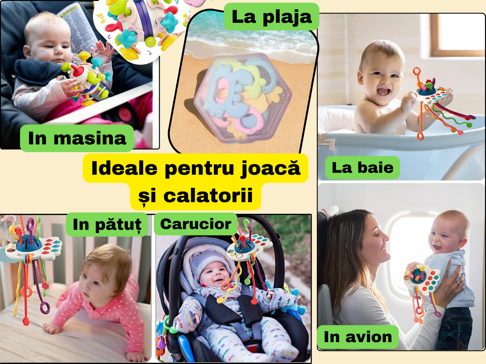 Jucaria tip caracatita: Cu tentacule flexibile, texturate si activitati captivante precum butoane glisante, inele de prins si sunete atragatoare, aceasta jucarie stimuleaza coordonarea mana-ochi si dezvoltarea senzoriala. Este usor de prins si de utilizat de mainile mici ale bebelusului si ofera o modalitate sigura si placuta de a calma disconfortul dentar.