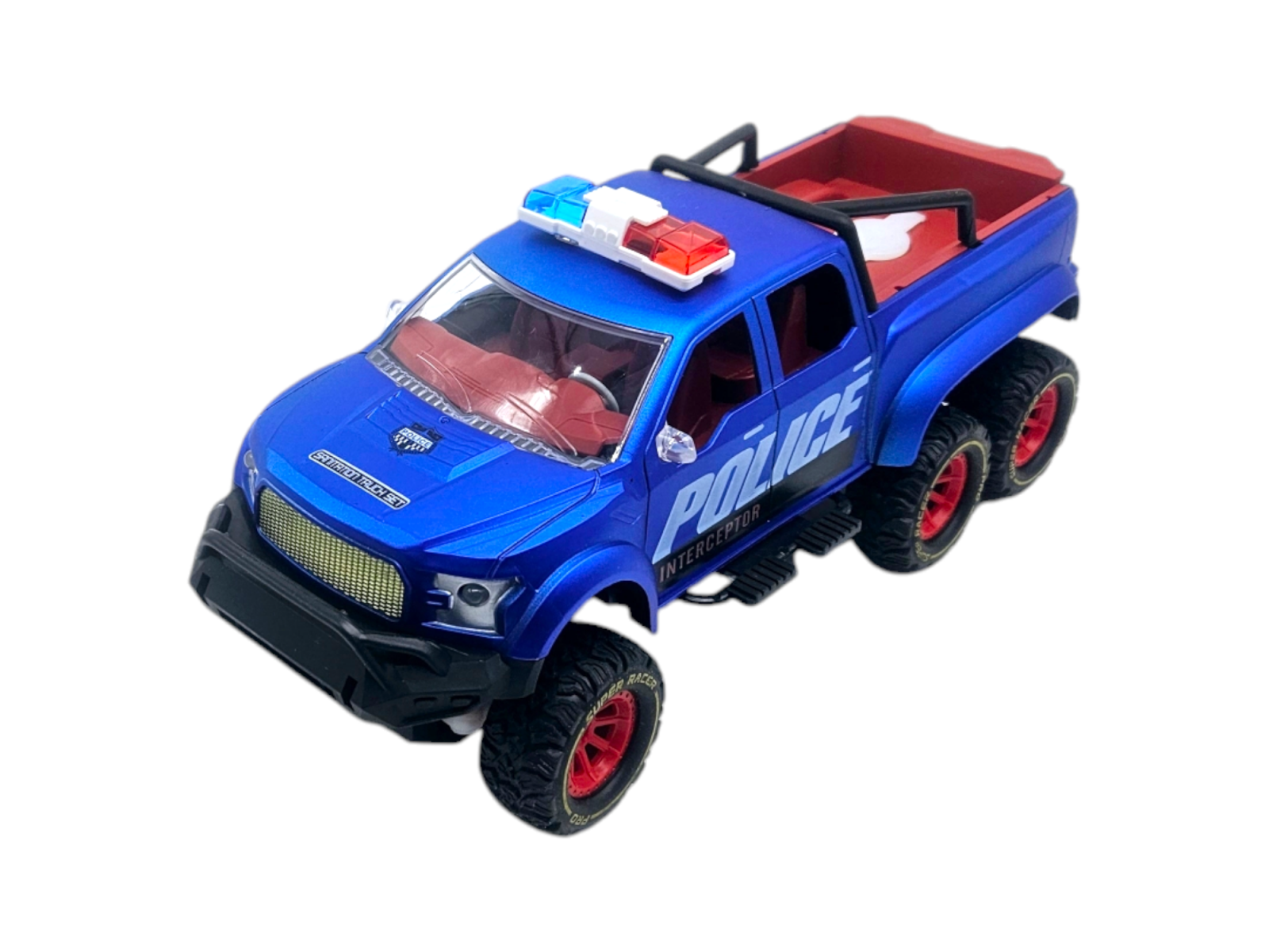 - Material: Fabricata din plastic rezistent, oferind durabilitate pentru utilizare intensa. Designul este realist, cu detalii specifice vehiculelor de politie.