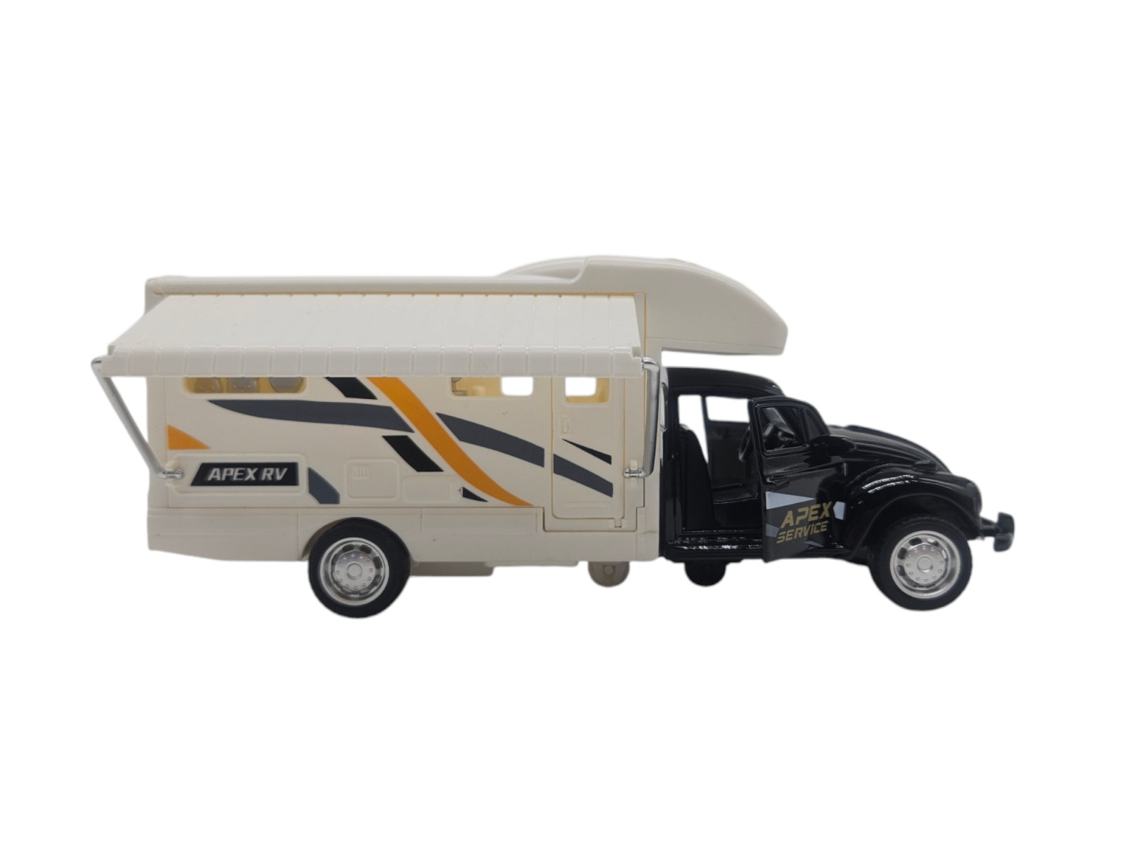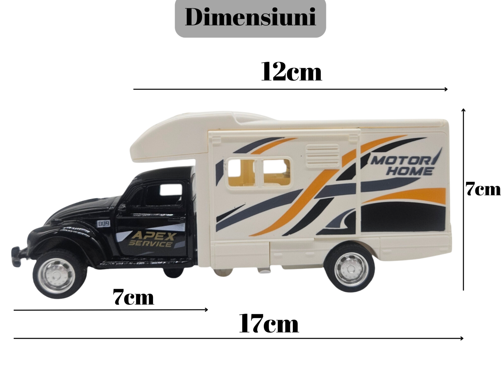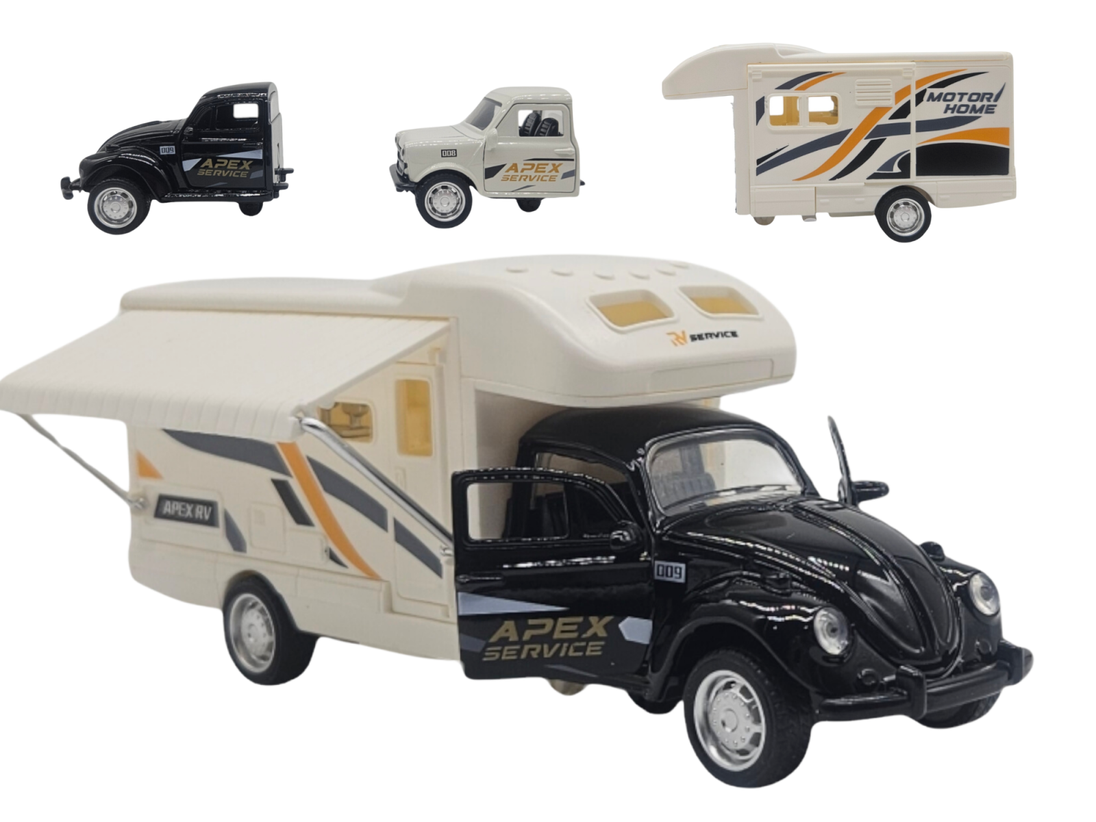Acest set de jucarii aduce bucuria aventurilor pe drumuri lungi chiar in mainile copiilor! Setul include doua masinute metalice robuste (partea frontala) in culorile alb si negru, si o rulota alba din plastic de calitate, dotata cu detalii realiste si functii interactive. Masinutele si rulota se conecteaza simplu si sigur printr-un sistem de magneti integrat, creand o experienta de joaca captivanta. Rulota ofera multiple functii: se extinde o sectiune laterala, are o marchiza care se deschide, iar usa rulotei este mobila. Mai mult, apasand pe rulota, copiii pot activa sunete si lumini, adaugand autenticitate si emotie jocului.