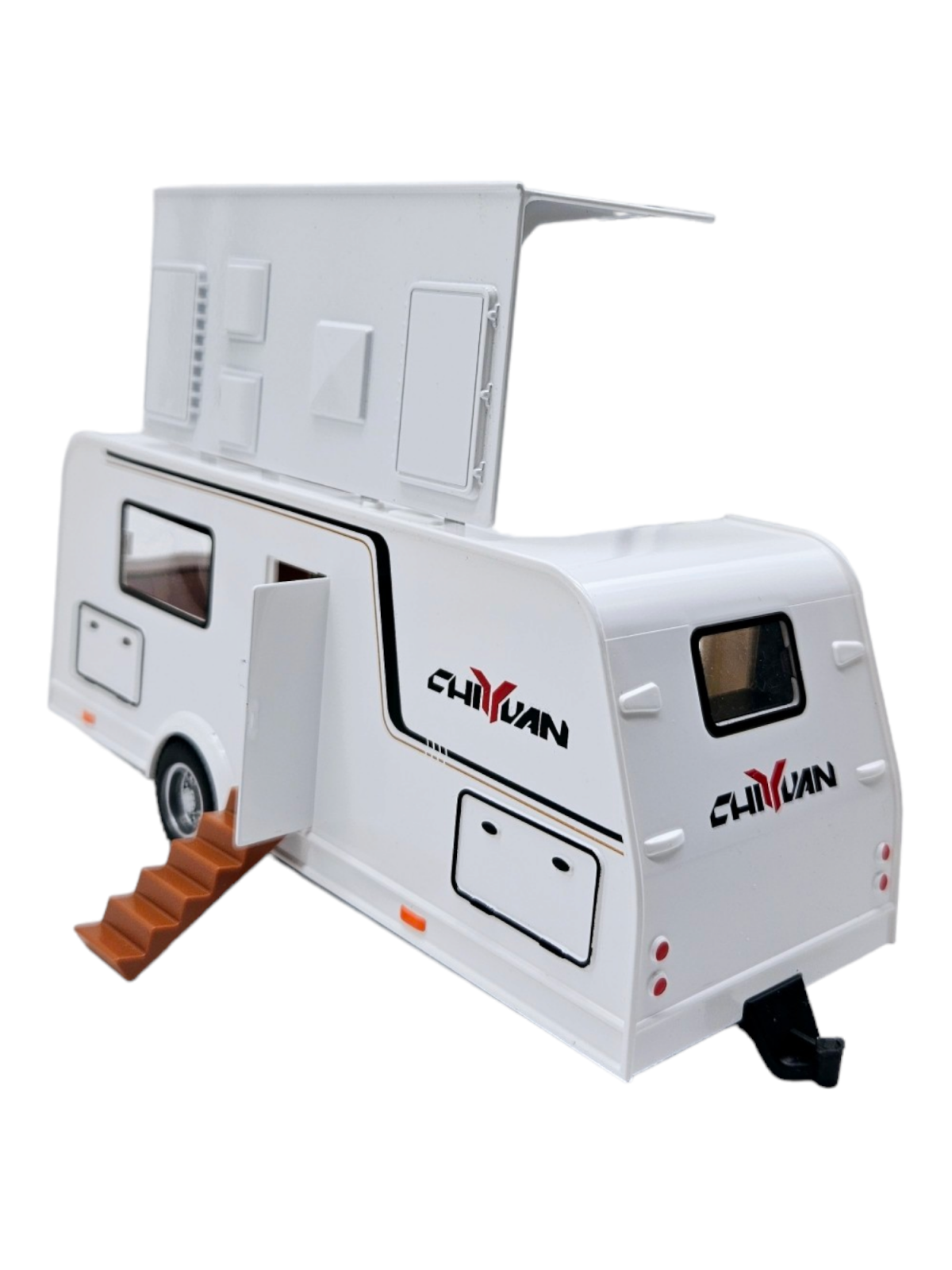 Aceasta masinuta metalica de jucarie cu rulota este o minunatie de design si functionalitate! Masinuta impresioneaza prin usile, capota si portbagajul care se deschid, permitand accesul usor la interiorul sau. Rulota este la fel de detaliata si impresionanta, avand o usa laterala cu o scara retractabila pentru acces facil. Geamurile laterale se deschid pentru aerisire, iar partea laterala se deschide pentru a crea un spatiu generos.