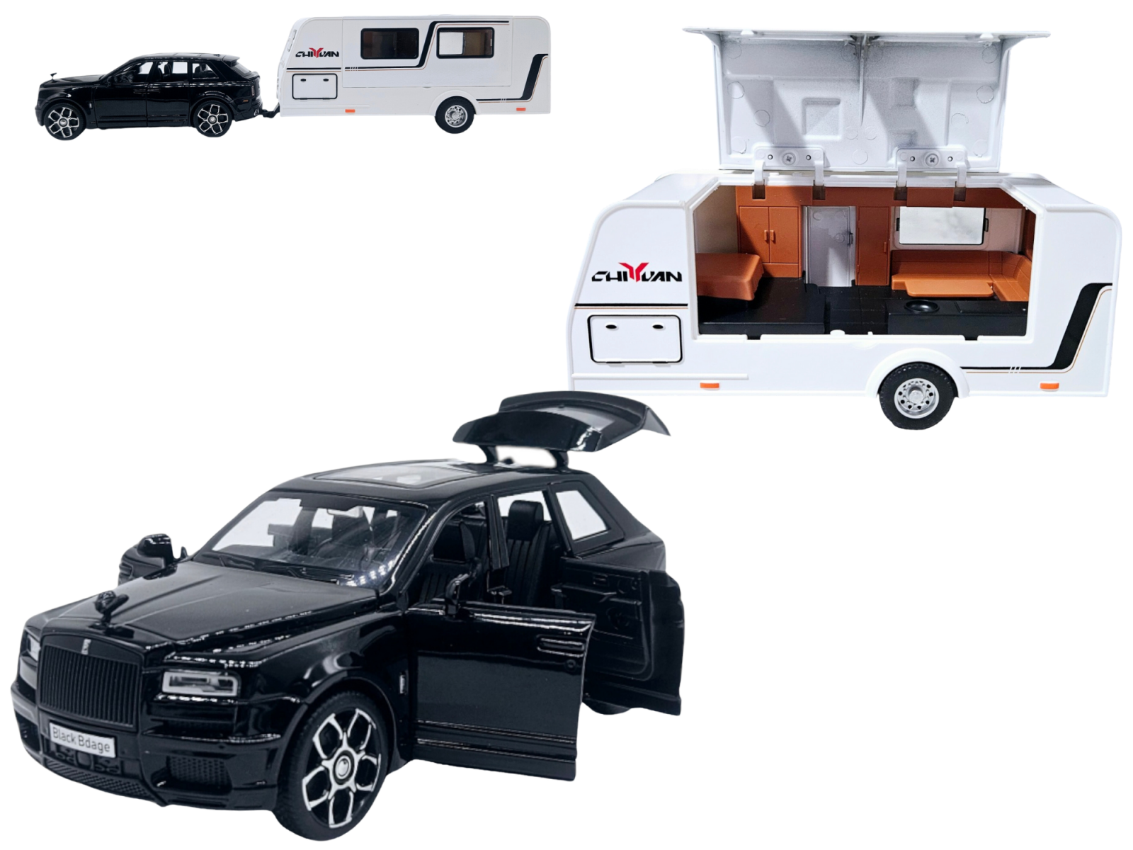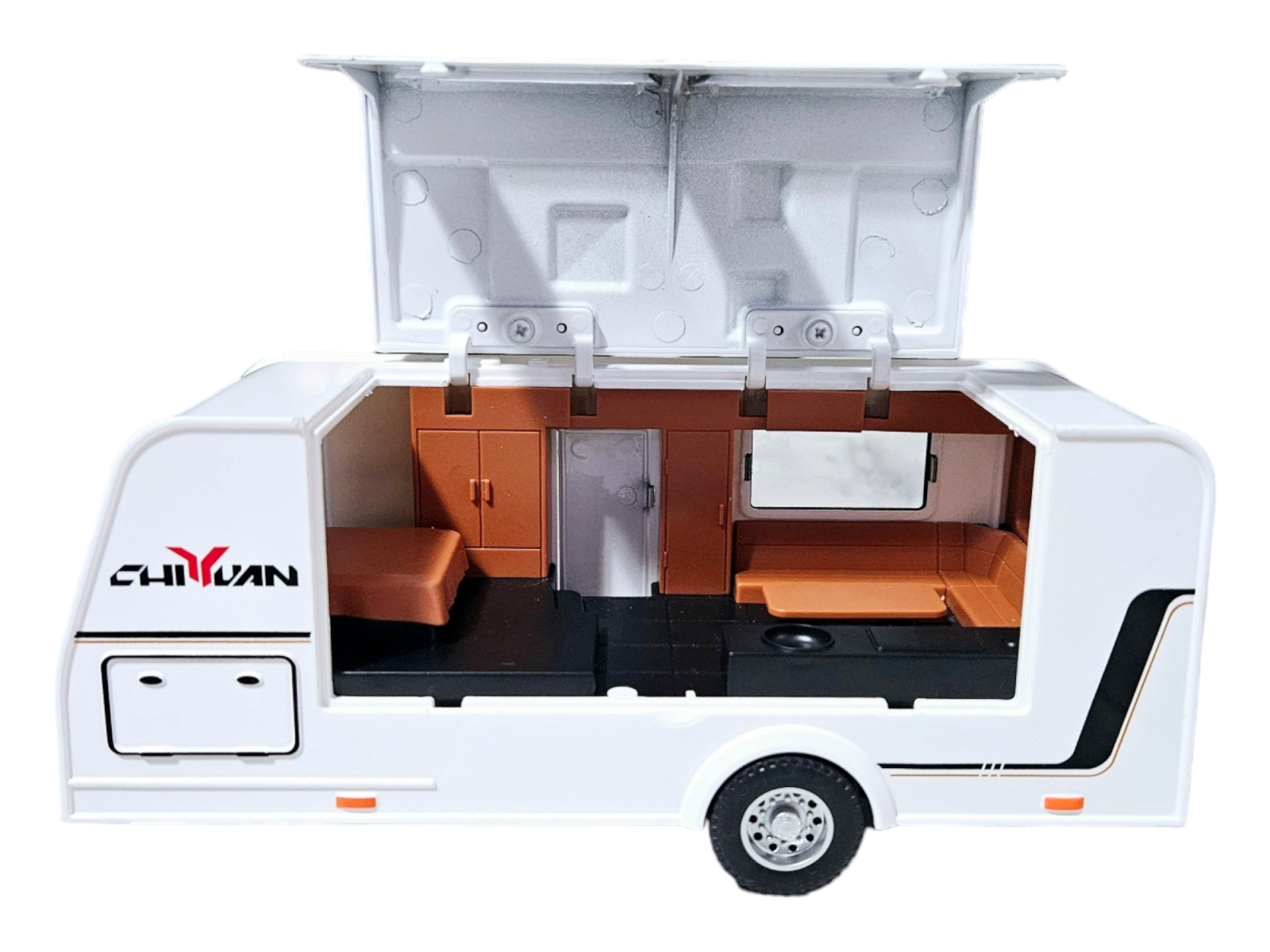 Aceasta masinuta metalica de jucarie cu rulota este o minunatie de design si functionalitate! Masinuta impresioneaza prin usile, capota si portbagajul care se deschid, permitand accesul usor la interiorul sau. Rulota este la fel de detaliata si impresionanta, avand o usa laterala cu o scara retractabila pentru acces facil. Geamurile laterale se deschid pentru aerisire, iar partea laterala se deschide pentru a crea un spatiu generos.