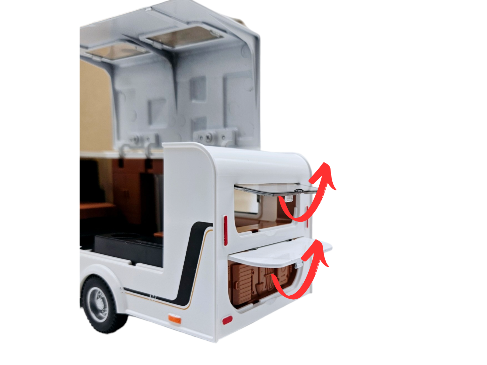 In interiorul rulotei, vei gasi un pat confortabil, dulapuri pentru depozitare, un coltar pentru relaxare, o bucatarie complet utilata cu masa si mobilier specific. Aceste detalii realistice aduc o nota de autenticitate si realism acestui set de jucarii, oferind copiilor posibilitatea de a se bucura de o experienta de joc captivanta si educativa.