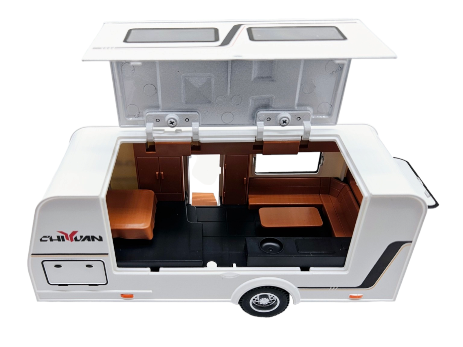 Aceasta masinuta metalica de jucarie cu rulota este o minunatie de design si functionalitate! Masinuta impresioneaza prin usile, capota si portbagajul care se deschid, permitand accesul usor la interiorul sau. Rulota este la fel de detaliata si impresionanta, avand o usa laterala cu o scara retractabila pentru acces facil. Geamurile laterale se deschid pentru aerisire, iar partea laterala se deschide pentru a crea un spatiu generos.