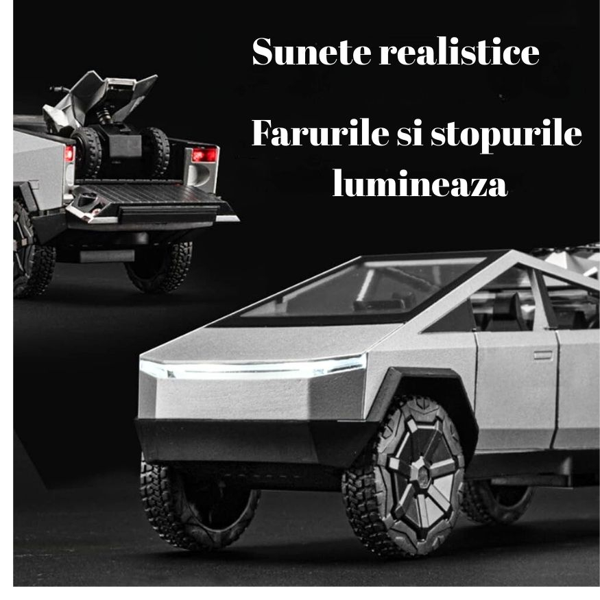 Masina este realizata din metal rezistent, cu usi care se deschid, faruri care se aprind si sunete realiste de motor.;